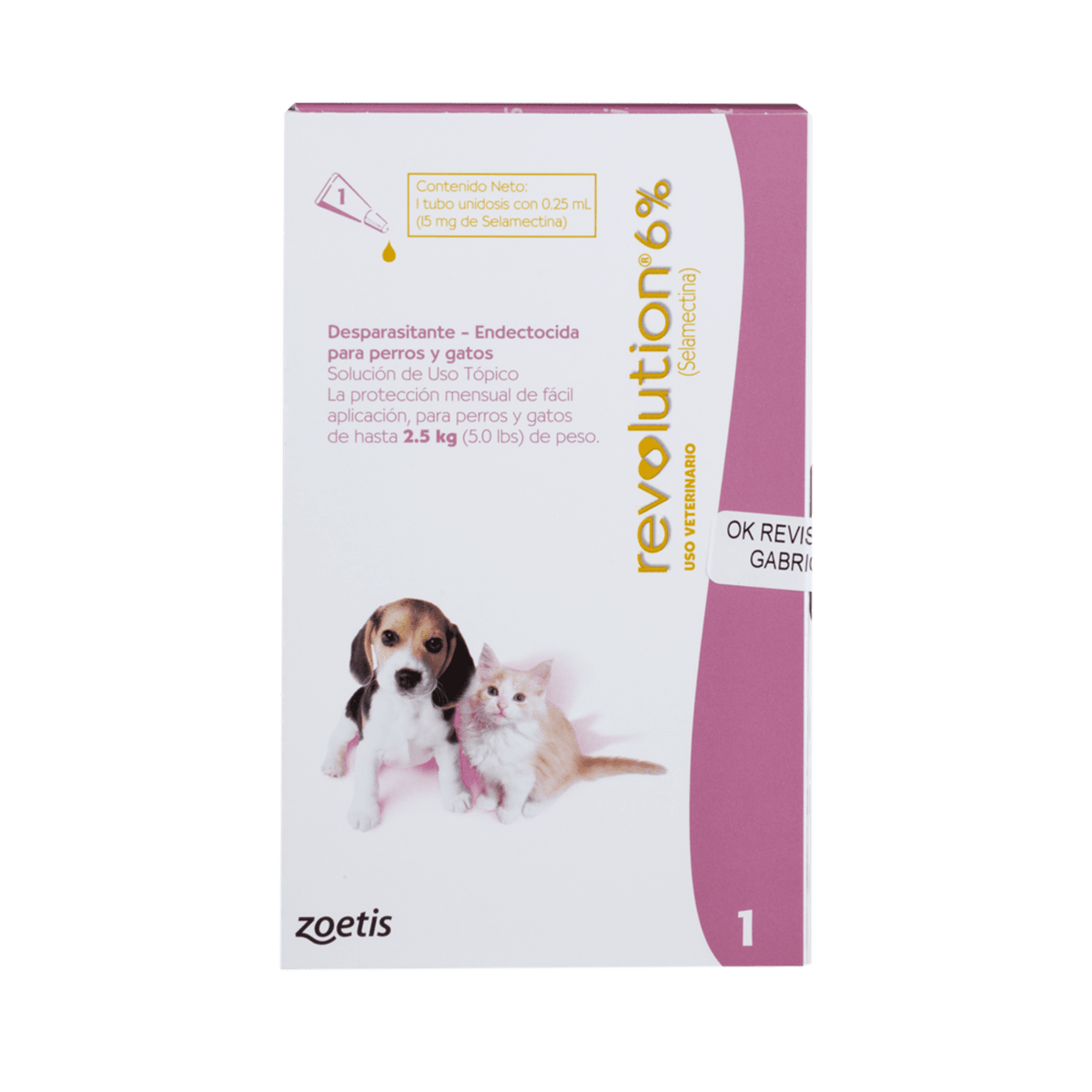 REVOLUTION 6% El ANTIPARASITARIO interno y externo para perros y gatos hasta 2,5 Kg de peso corporal de no menos de 6 semanas de edad. Adminsitrado mensualmente, es un medicamento indicado para el tratamiento y control de infestaciones por pulgas (especies de ctenocephalides), control de microfilarias del parásito Dirofilaria imitis (gusano del corazón) y el tratamiento y control de ácaros de las orejas (Otodectes cynotis) y los piojos (Trichodectes canis y Felicola subrostratus) en perros y gatos. También indicado para el tratamiento y control de los anquilostomas (Ancylostoma tubaeforme) y los nemátodos intestinales (Toxocara cati) en gatos y los nemátodos intestinales (T. canis, Toxascaris leonina) y la sarna (sarcoptes scabiei) en perros, y como una ayuda en el control de garrapatas (Riphicelphalus sanguineus y Dermacentor variablis) en perros. Inocuidad en hembras gestantes, lactantes, perros de razas sensibles (P. Collie, Shetland, P. Inglés).